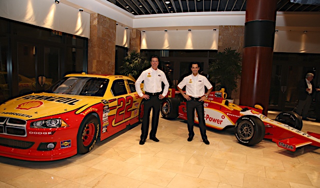 02 December, 2010: Kurt Busch, Helio Castroneves and Roger Penske during Shell announcement during 2010 NASCAR Sprint Cup Series Champions Week in Las Vegas, NV. (HHP/Harold Hinson)