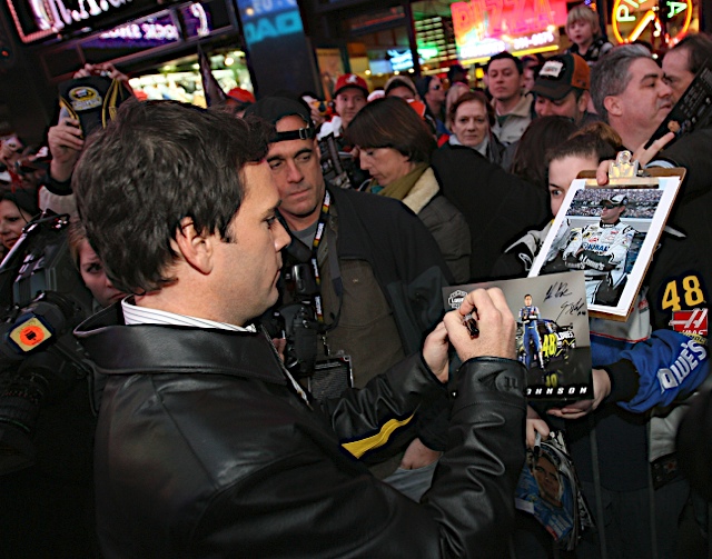 04 December 2008 - Jimmie Johnson signs autographs in Times Square during Champions Week in New York City. (HHP/Harold Hinson)
